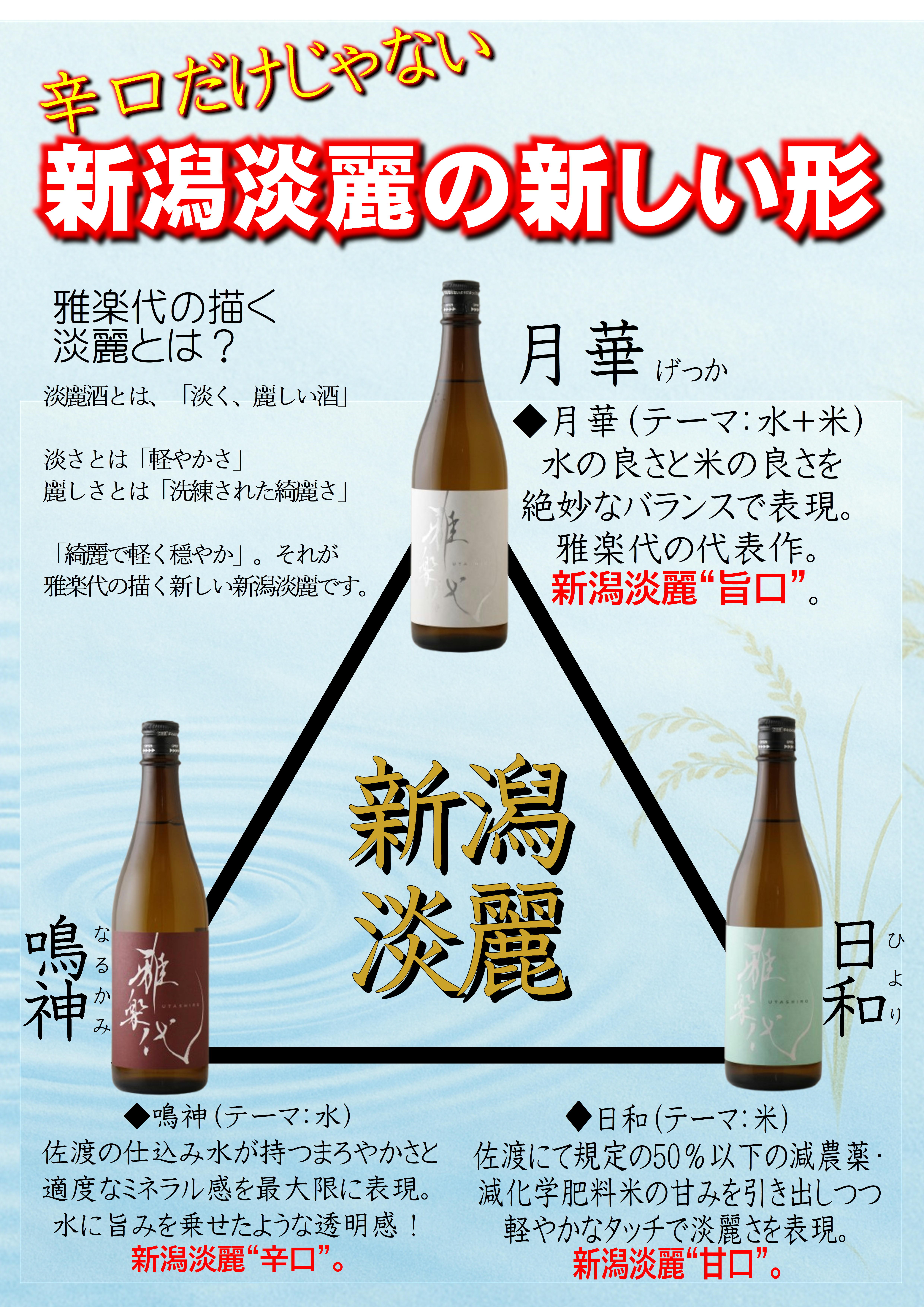 2019年には新ブランド「雅楽代」並びに「THE REBIRTH」をリリース。以降、蔵元自らが酒造りの先頭に立つ、「蔵元杜氏」に就任。この年以降、大幅な設備投資を毎年行い、品質第一を掲げ、日々品質向上に励んでいます。 醸造哲学 〜心きらめく酒造り〜 お酒造りにおいて最も大切にしているもの。それは「心がきらめくかどうか」。 美味しいお酒は心がきらめく。どれだけの手間ひまがかかろうが、それが美味しいお酒に繋がるのならば、全て行う徹底的に品質を追い求めた酒造り。 自分達のお酒に完成形などなく、常に最高傑作は次の作品。飲み手が心ときめく瞬間を創っていくことを掲げています。 2024年からは「新しい新潟淡麗」をコンセプトに、これまでの新潟淡麗のアンチテーゼではなく、今の時代に合ったこれからの新潟淡麗のあり方を示すような、新潟淡麗復活の狼煙を上げる酒を造る事を目指して酒造りに励んでいます。 |